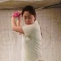 高く上げ左へ低く降り抜く「スライス打ち」を覚える素振り