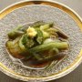 キンキンに冷えたお皿に、これまたよく冷えたナスとズッキーニがなんとも涼しげ。厚めに切ったナスとズッキーニは高温でしっかり素揚げにしてから煮るので、煮崩れがなく、エッジが立って見た目もシャキッ。サック…