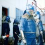 ガスマスクを装着し頭部からすっぽりとかぶる全身黒ずくめの化学防護服を着た機動隊員の手には、かごに入った小さなカナリア。美しい声で鳴くその鳥は空気の変化に敏感で、ガスを感知するとすぐに反応することから…