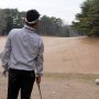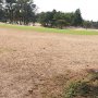 江戸崎CC14番ホール(パー4・385ヤード)、第2打地点に来ています(写真①)。 だいたいこのホールの第2打はフラットな地点から打てたものですが、最近は飛ばし屋が多くなって、下りに入る地点…