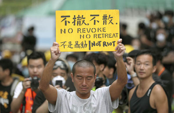 「逃亡犯条例」改正案の撤回や林鄭月娥行政長官の辞任を求め、抗議のプラカードを掲げる男性(C)共同通信社