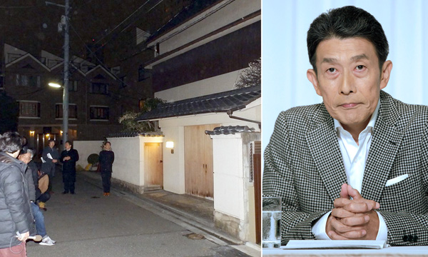 降りしきる雨の中、自宅前に集まる関係者と報道陣(左 東京・港区)/(C)日刊ゲンダイ