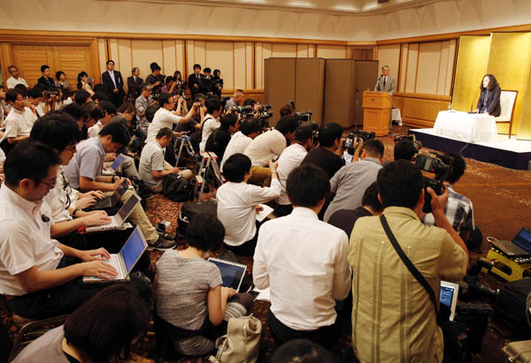 報道陣を前に会見するピース又吉(C)日刊ゲンダイ
