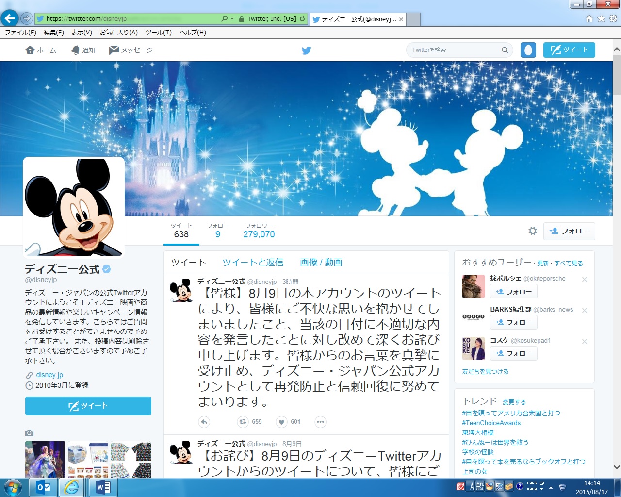 問題のツイートから8日…(ディズニーの公式ツイッターから)