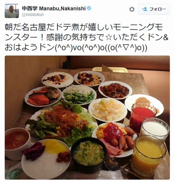 1人分とは思えないボリューム(写真は7日の朝食)/(中西学のツイッターから)