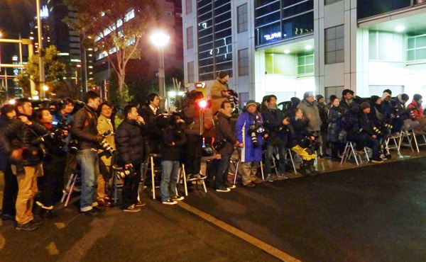 フジテレビ前に詰めかけた報道陣とファン(18日)/(C)日刊ゲンダイ