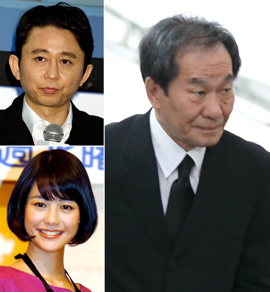 田邊昭知社長(右)と有吉弘行・夏目三久/(C)日刊ゲンダイ