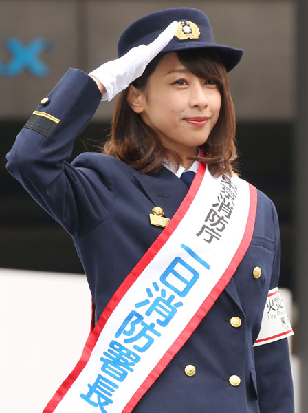 カトパンが久々“コスプレ” 消防演習で「放水!」の大号令