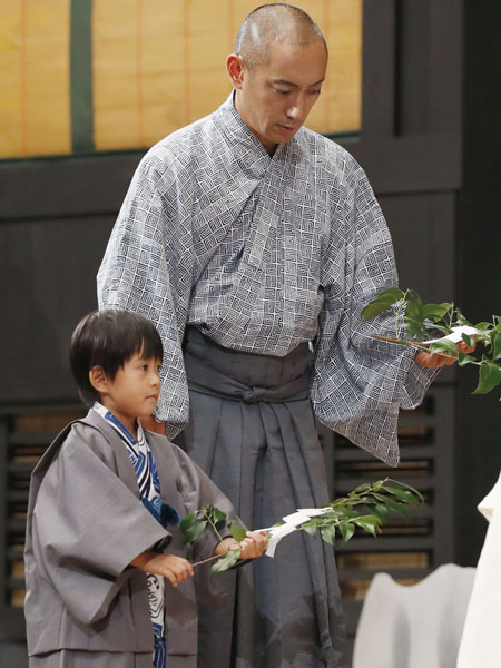 市川海老蔵と長男の勸玄君(C)共同通信社