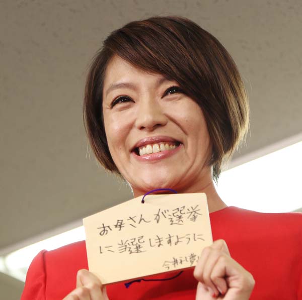 当選直後は息子が書いた絵馬を手にして喜んだ(C)日刊ゲンダイ