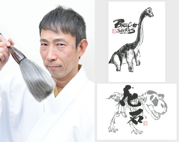書家「宇都鬼」としても活躍(右は本人の好きな恐竜を描いた作品=提供写真)