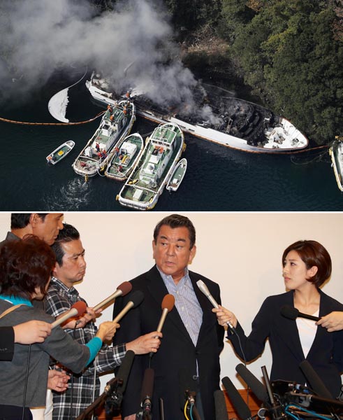 炎上する光進丸(上・共同通信ヘリから)2日夜、会見を開いた加山雄三(下)/(C)共同通信