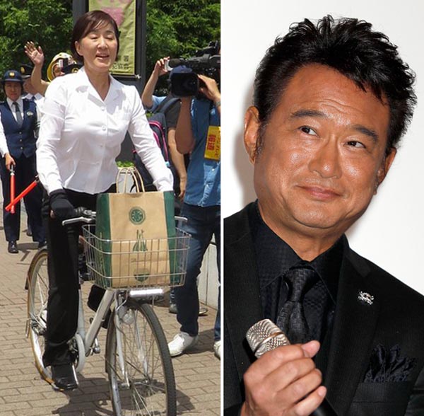 自転車で警察に出頭した松居一代(左)と船越英一郎/(C)日刊ゲンダイ