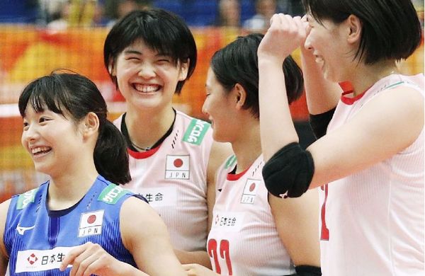 ドイツに勝利し、喜ぶ黒後(左から2人目)ら日本チーム=横浜アリーナ