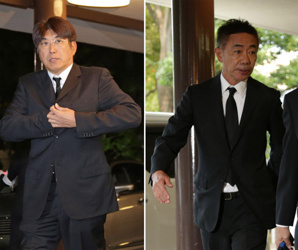 通夜に訪れたとんねるずの石橋貴明(左)と木梨憲武/(C)日刊ゲンダイ