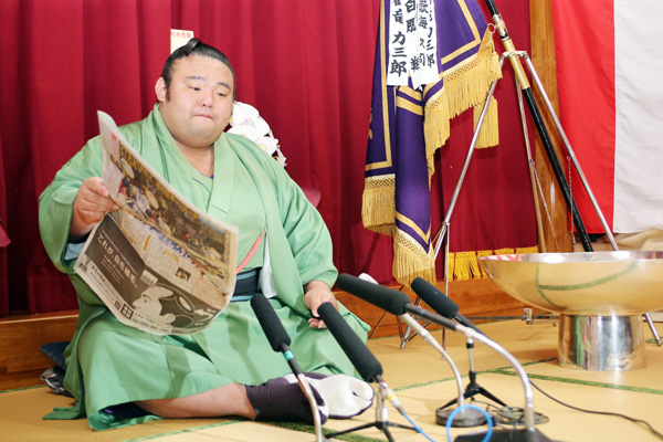初優勝した元弟子の貴景勝(26日、一夜明け会見)(C)日刊ゲンダイ