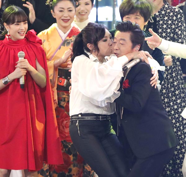 桑田佳祐にキスする松任谷由実(紅白歌合戦)/(C)日刊ゲンダイ