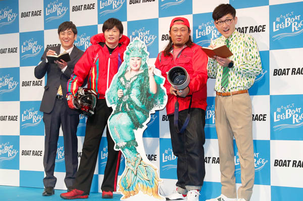 ボートレース新CMシリーズ「姫たちだってLet’s BOAT RACE」発表会田中圭(左から2人め)とロバート(C)日刊ゲンダイ