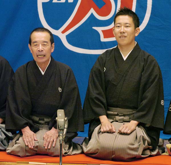 襲名興行であいさつする林家木久扇を襲名した林家木久蔵(左)と2代目木久蔵を襲名した林家きくお(2007年)(C)共同通信社