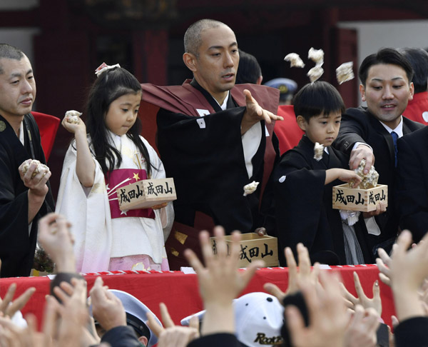 勸玄くん、麗禾ちゃんとともに成田山新勝寺の節分会で豆をまく市川海老蔵(C)共同通信社