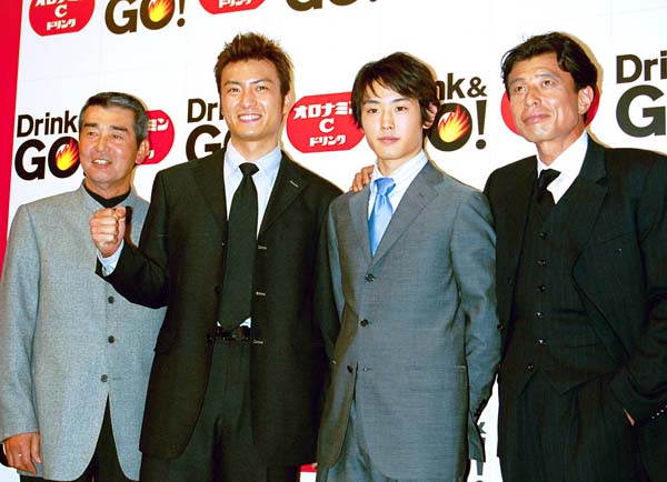 2002年「オロナミンC」CM会見で。左から渡哲也、徳重聡、渡邉邦門、舘ひろし(C)日刊ゲンダイ