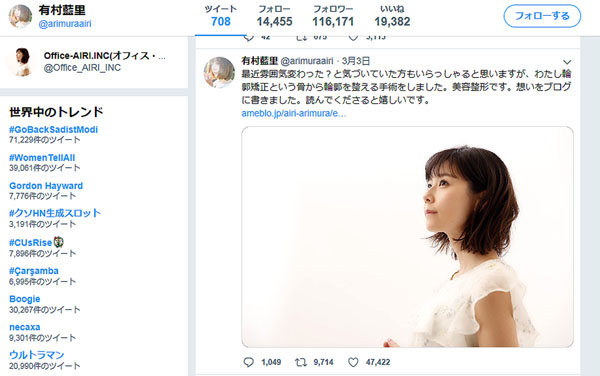 有村藍里に多くの支持 芸能人の整形アウトとセーフの境目