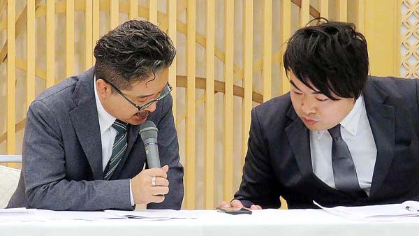 結果報告の会見をするAKSの役員ら(C)日刊ゲンダイ