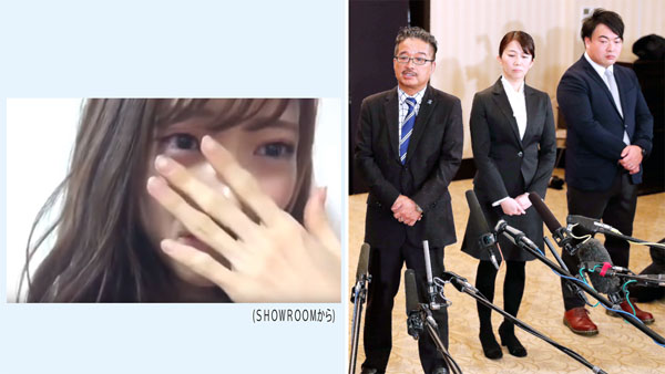 涙で被害を訴える山口。右は左から運営統括責任者の松村、NGT48劇場新支配人の早川、新副支配人の岡田の3氏(C)日刊ゲンダイ