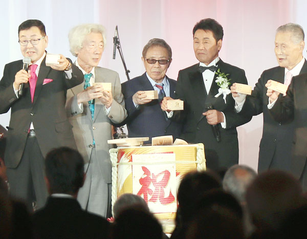 (左から)ニトリHD似鳥昭雄会長、小泉純一郎元首相、北島三郎、五木ひろし、森喜朗元首相(C)日刊ゲンダイ