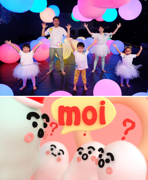 ダンスを踊る子供たち(上)と番組のキャラクター「ぷしゅぷしゅ」(テレビ東京「シナぷしゅ」から)/(提供:テレビ東京)