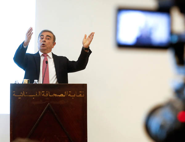 ベイルートで会見をするカルロス・ゴーン被告(C)ロイター