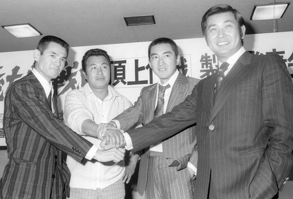 映画「仁義なき戦い 頂上作戦」の製作発表(左から菅原文太、梅宮辰夫、松方弘樹、小林旭、1973年11月)/(C)共同通信社