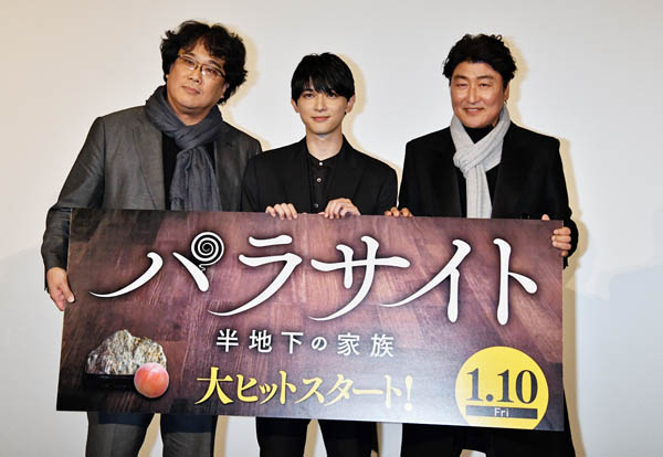 第72回カンヌ国際映画祭パルムドールを受賞(左からポン・ジュノ監督、吉沢亮、ソン・ガンホ)/(C)UPI/ニューズコム/共同通信イメージズ