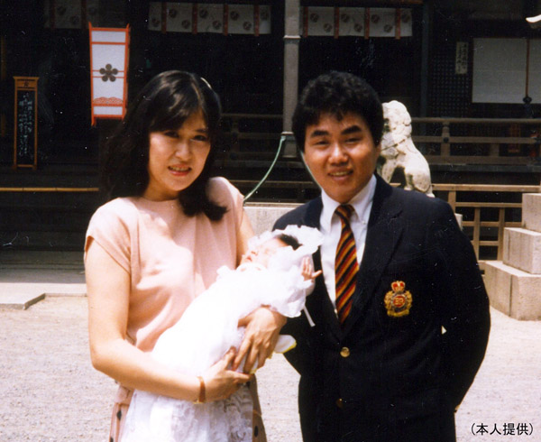 おもろい(?)娘のお宮参りで、春けいこさんと横山ひろしさん夫妻(1985年、大阪の天満宮)/(提供写真)
