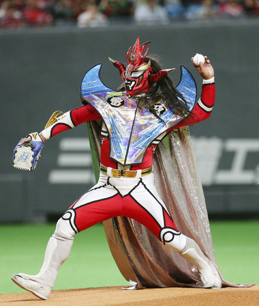 札幌ドームで始球式を務める獣神サンダー・ライガー(2019年6月)/(C)共同通信社