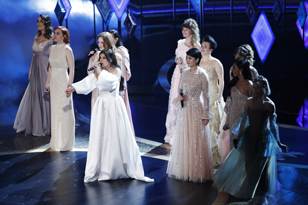 世界各国のエルサと「アナと雪の女王2」の主題歌を歌う松たか子(中央右)(C)ロイター