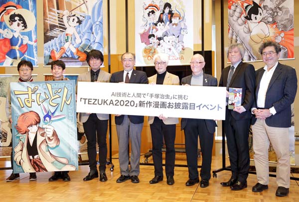 「TEZUKA2020」新作漫画お披露目イベント(左から迎山和司、矢部太郎、栗原聡、百冨正樹、手塚眞、ちばてつや、三浦敏宏、松原仁)/(C)日刊ゲンダイ