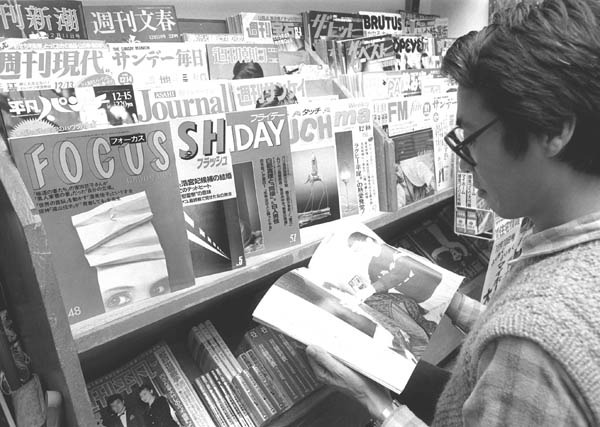 本屋の店頭に並ぶフライデー、フォーカス、フラッシュ、エンマ、タッチの5誌(=1986年)/(C)共同通信社