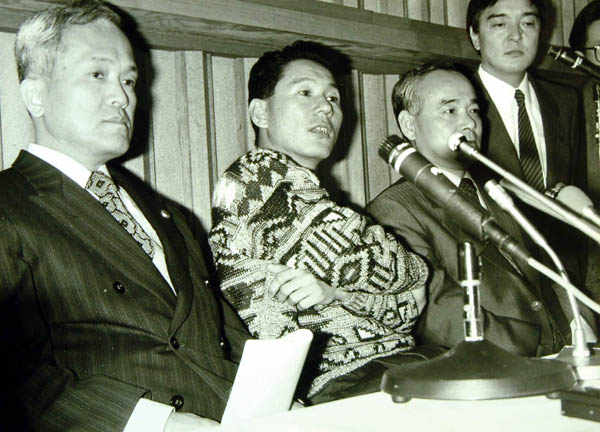 逮捕後初の記者会見でのビートたけし(中央)/(C)日刊ゲンダイ