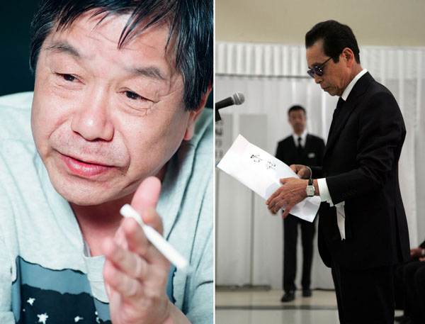 赤塚不二夫(左)の告別式で弔辞を述べるタモリ(C)日刊ゲンダイ