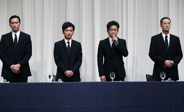 2018年、山口達也の強制わいせつ容疑の書類送検を受け、謝罪会見をするTOKIOのメンバー(左から)長瀬智也、国分太一、城島茂、松岡昌宏(C)日刊ゲンダイ