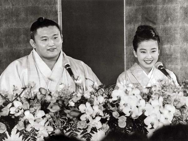 婚約記者会見での貴花田(左)と宮沢りえ(C)日刊ゲンダイ