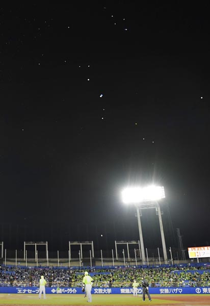神宮球場の上空に飛来した大量の風船(C)共同通信社