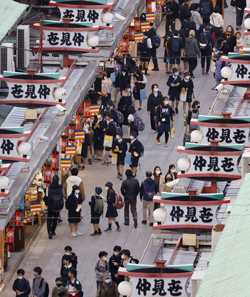18日、東京・浅草の仲見世通りをマスク姿で歩く人たち(C)共同通信社