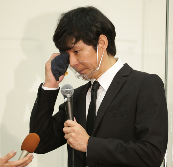 渡部建の会見は汗ダラダラで100分にも及んだ(C)日刊ゲンダイ