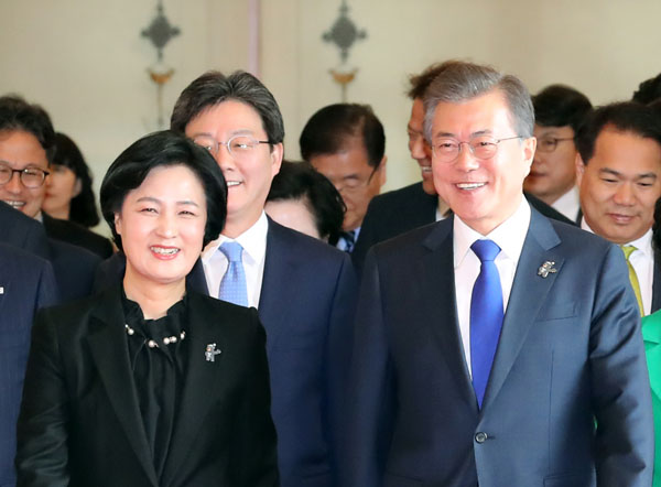 秋美愛法相(左)と文在寅大統領(C)YONHAPNEWS/ニューズコム/共同通信イメージズ