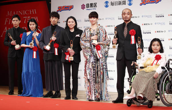 左から上村侑、蒔田彩珠、森山未來、梶芽衣子、水川あさみ、宇野祥平、佳山明(C)日刊ゲンダイ