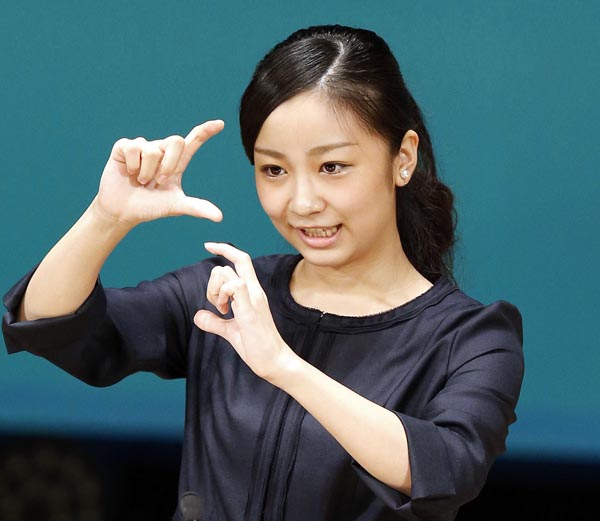 手話を使ってあいさつされる秋篠宮家の次女佳子さま(C)共同通信社