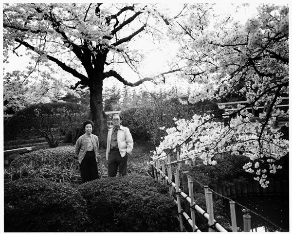 桑原甲子雄さん夫妻。桑原さんが恒例で催す馬事公苑のお花見で(1983年ごろ撮影)/(提供写真)