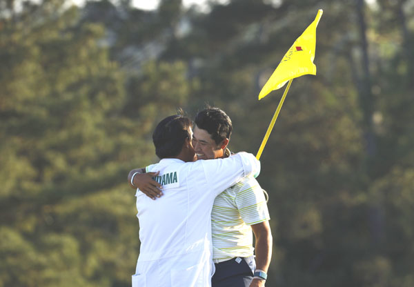 マスターズ優勝が決まった瞬間の松山英樹と早藤キャディー(C)ロイター